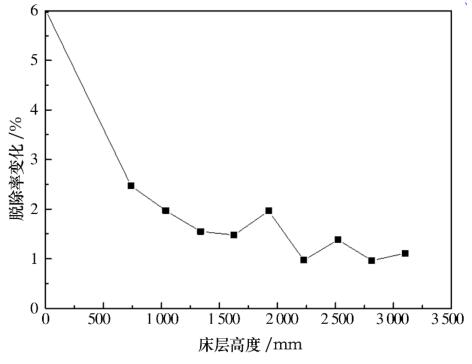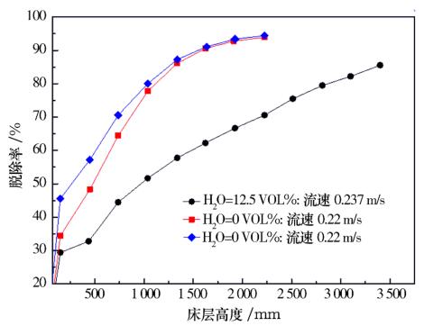 在煙氣含水蒸汽12.5%、氨水濃度飽和的條件下,采用滿足指標(biāo)要求的活性炭,當(dāng)床層高度超過3m時(shí),NOx脫除率超過80%,如圖4所示。