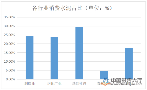 水泥消費幾乎出現在所有20個國民經濟行業門類中,任何一個門類的投資活動,都有水泥的身影。這其中,與水泥消費關系最密切的有六大門類,分別是制造業,房地產業,水利、環境和公共設施管理業,交通運輸、倉儲和郵政業,農、林、牧、漁業,電力、熱力、燃氣及水的生產和供應業。