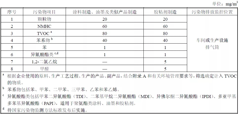 表3.涂料、油墨及膠粘劑工業大氣污染物特別排放限值