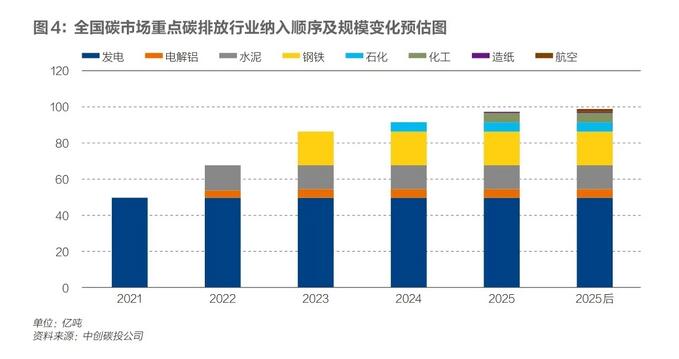 在碳市場涵蓋的范圍方面,未來以怎樣的節奏納入更多行業,尚未明確。首個控排行業發電行業的碳排放總量約為40億噸,若電解鋁、水泥、鋼鐵、化工、造紙、石化、航空等七大高耗能行業全部納入全國碳市場,碳排放總量預計在80億/年噸至100億噸/年之間。