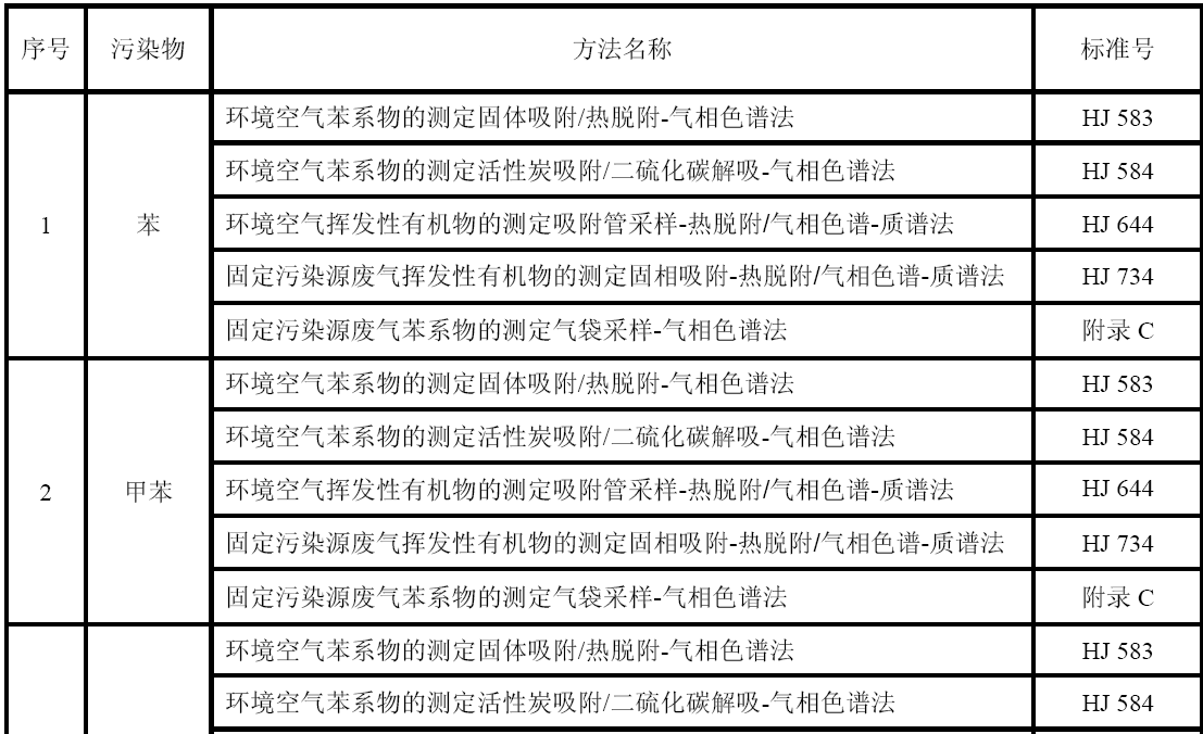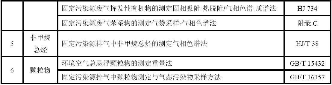 GB 16297 大氣污染物綜合排放標準 GB 24409 汽車涂料中有害物質限量 GB/T 15089 機動車輛及掛車分類 GB/T15432 環(huán)境空氣總懸浮顆粒物的測定重量法 GB/T 16157 固定污染源排氣中顆粒物測定與氣態(tài)污染物采樣方法 HJ 583 環(huán)境空氣苯系物的測定固體吸附/熱脫附-氣相色譜法 HJ 584 環(huán)境空氣苯系物的測定活性炭吸附/二硫化碳解吸-氣相色譜法 HJ 644 環(huán)境空氣揮發(fā)性有機物的測定吸附管采樣-熱脫附/氣相色譜-質譜法 HJ 732 固定污染源廢氣揮發(fā)性有機物的采樣氣袋法 HJ 734 固定污染源廢氣揮發(fā)性有機物的測定固相吸附-熱脫附/氣相色譜-質譜法 HJ/T 38 固定污染源排氣中非甲烷總烴的測定氣相色譜法 HJ/T 55 大氣污染物無組織排放監(jiān)測技術導則 HJ/T 75 固定污染源煙氣排放連續(xù)監(jiān)測技術規(guī)范(試行) HJ/T 194 環(huán)境空氣質量手工監(jiān)測技術規(guī)范 HJ/T 293 清潔生產(chǎn)標準汽車制造業(yè)(涂裝) HJ/T 397 固定源廢氣監(jiān)測技術規(guī)范 《建設項目環(huán)境保護設施竣工驗收監(jiān)測技術要求(試行)》(環(huán)發(fā)(2000)38號)