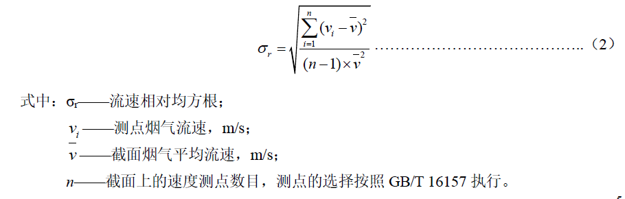 新建煙氣排放污染源的在線監(jiān)測設(shè)備安裝要求,采樣平臺應(yīng)與排氣裝置同步設(shè)計(jì)、同步建設(shè),確保采樣斷面滿足本標(biāo)準(zhǔn) 7.1.2.2 的要求;對于現(xiàn)有排放源,當(dāng)無法找到滿足 7.1.2.2 的采樣位置時(shí),應(yīng)盡可能選擇在氣流穩(wěn)定的斷面安裝 CEMS 采樣或分析探頭,并采取相應(yīng)措施保證監(jiān)測斷面煙氣分布相對均勻,斷面無紊流。對煙氣分布均勻程度的判定采用相對均方根σ 法,當(dāng)σ ≤0.15 時(shí)視為煙氣分布均勻,σr 按式(2)計(jì)算。