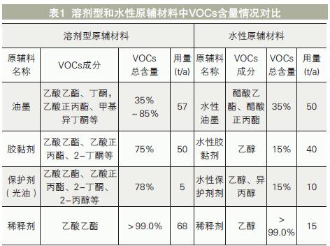某薄膜印刷企業分別采用溶劑型和水性原輔材料生產同一產品的情況下,VOCs的成分及含量對比情況見表1。該企業改用水性材料后,VOCs產生量減少了約80%。可見采用水性原輔材料可大大減少VOCs排放種類和數量。
