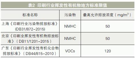 塑料軟包裝印刷企業產生的廢氣量較大,大部分企業VOCs濃度在5000ppm以下,屬中低濃度,其中烘干廢氣的溫度通常在50~80℃,VOCs年排放總量大。目前國內對于印刷行業VOCs排放執行的標準主要為地方標準,具體見表2。南京地區主要參照的是上海市《印刷行業污染物排放標準》(DB31/872-2015)。