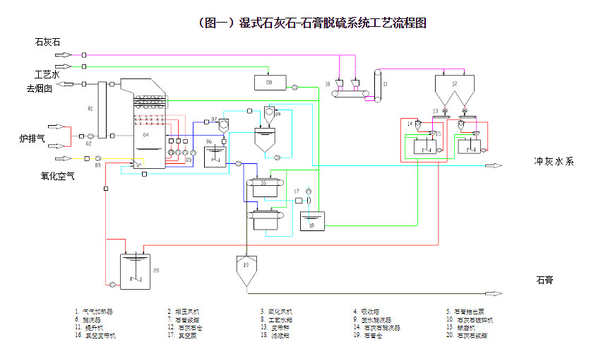 石灰石(石灰)/石膏濕法脫硫工藝系統主要有:煙氣系統、吸收氧化系統、漿液制備系統、石膏脫水系統、排放系統組成。